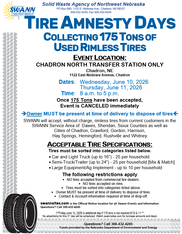 SWANN will accept, without charge, rimless tires from current customers in the SWANN Service Area of: Dawes, Sheridan, Sioux Counties as well as Cities of Chadron, Crawford, Gordon, Harrison, Hay Springs, Hemingford, Rushville and WhitneyAcceptable Tire Specifications: